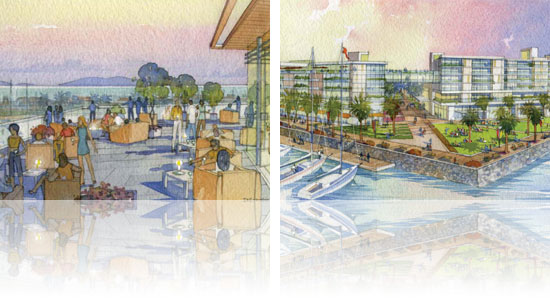Proposed replacement of existing dated retail facility with a mixed-use project including apartments, dining, and shopping. The proposed design is pedestrian-oriented, with a large waterfront promenade and underground parking. Fisherman’s Wharf is located at the Southwest corner of Victoria and Channel Islands Blvd.